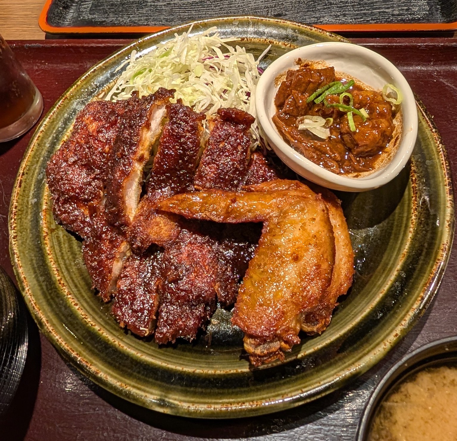 今回はスイーツではなく名古屋駅の「キッチンなごや」にて、なんと味噌カツ、名古屋コーチン手羽先、味噌どて煮がセットになった名古屋ぜいたく定食を食べに行きました🍻